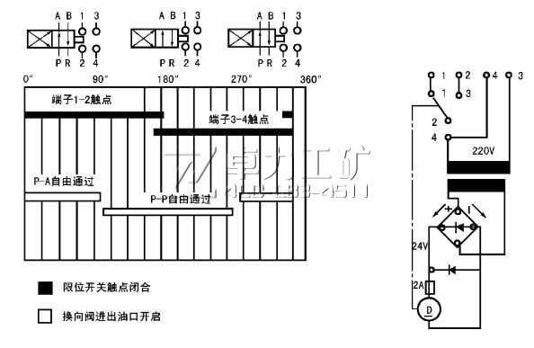 24EJF-P型二位四通換向閥(40MPa)主要由直流電機、限位開關(guān)、換向閥體,整流變壓器裝置等元件安裝于同一底板上并置于防護罩殼內(nèi)組成。