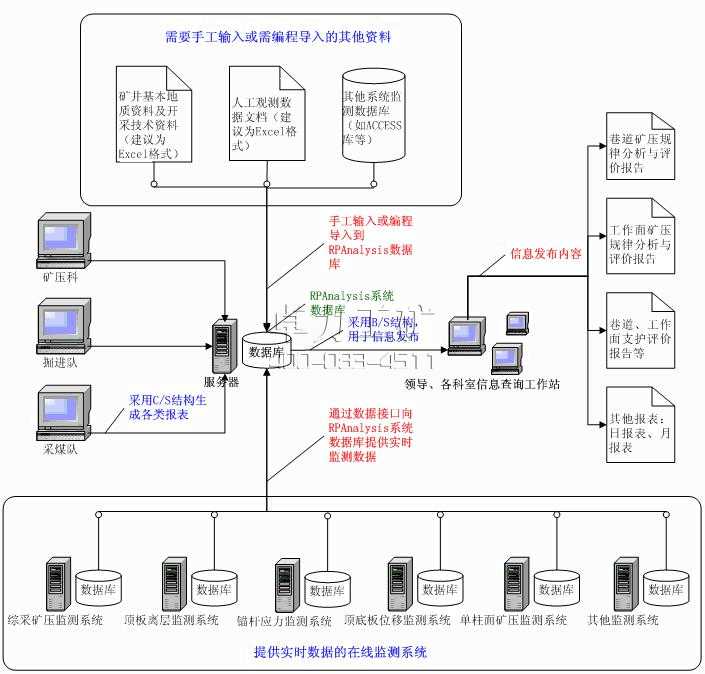 在山東科技大學(xué)礦壓理論研究基礎(chǔ)上,采用新的軟件設(shè)計理念、先進(jìn)的軟件開發(fā)工具以及可視化技術(shù)、數(shù)據(jù)庫技術(shù)等研發(fā)了這套RPAnalysis系統(tǒng)。該系統(tǒng)按采場選用支護(hù)設(shè)備的不同分為單體、綜采、綜放三個部分,巷道則按照回采巷道、掘進(jìn)巷道進(jìn)行分類,分別使用于炮采和普采工作面、綜采工作面、綜放工作面、回采巷道、掘進(jìn)巷道。利用礦壓理論、人工智能、模糊數(shù)學(xué)、有限元等進(jìn)行推理出支柱支護(hù)密度及強(qiáng)度相關(guān)的支護(hù)數(shù)據(jù),比經(jīng)驗(yàn)支護(hù)更科學(xué),更合理。它不僅包容大量理論、實(shí)踐成果和專業(yè)知識,而且借助實(shí)時監(jiān)測數(shù)據(jù)庫近乎無窮的知識記憶力和功能擴(kuò)散力,發(fā)揮出以專家系統(tǒng)代替專家工作的特殊作用,是加強(qiáng)采場及巷道安全管理,防止頂板事故的有效手段,高度體現(xiàn)了礦壓觀測數(shù)據(jù)分析與評價的科學(xué)性,合理性。系統(tǒng)功能