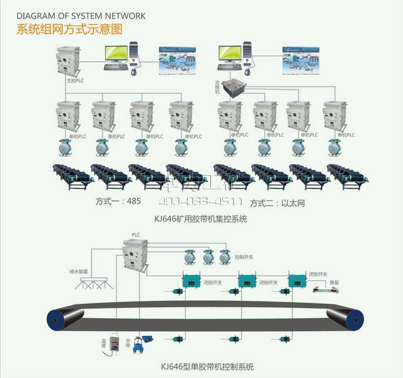 KJ646煤礦用帶式輸送機(jī)電控系統(tǒng)的設(shè)計是以《煤礦安全規(guī)程》為依據(jù),對煤礦井下實(shí)際情況進(jìn)行考察之后,綜合各方面的要求設(shè)計出來的,監(jiān)控設(shè)備的種類、數(shù)量、性能符合《煤礦安全規(guī)程》的有關(guān)規(guī)定,適用各類大中小型煤礦。該系統(tǒng)可采集跑偏、閉鎖、撕裂、溫度、煙霧、速度、煤位等性能參數(shù),以及設(shè)備開停等生產(chǎn)參數(shù),可以控制設(shè)備的起動、停止,是煤礦安全生產(chǎn)的必備設(shè)備。