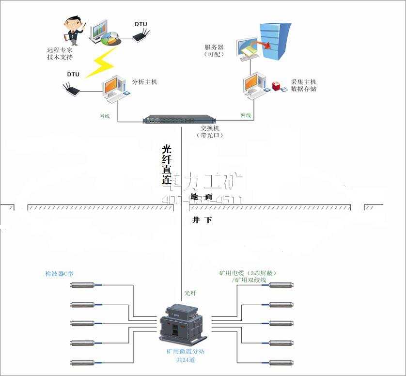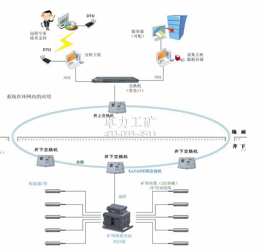 礦用微震系統(tǒng)由采集主機(服務器)、分析主機、交換機、信號傳輸設備(電轉(zhuǎn)光口設備、光纜、電纜、接線盒)、KJ699礦用微震監(jiān)測分站、拾震器GZC4.5A、環(huán)網(wǎng)交換機(地面交換機)、UPS電源、服務器等組成。