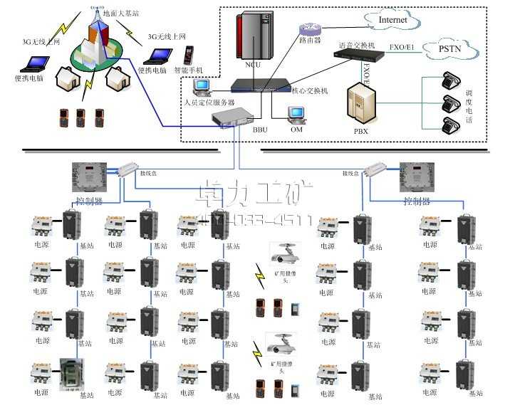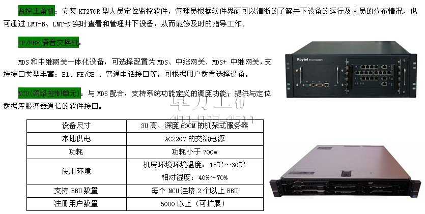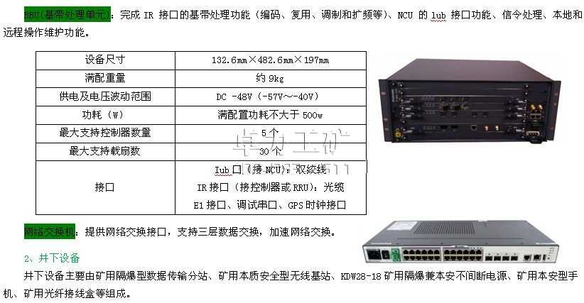 井上設備主要包括監(jiān)控主(備)機、IP/PBX語音交換機、NCU(網(wǎng)絡控制單元)、BBU(基帶處理單元)、網(wǎng)絡交換機、UPS電源、打印機、避雷器等組成。