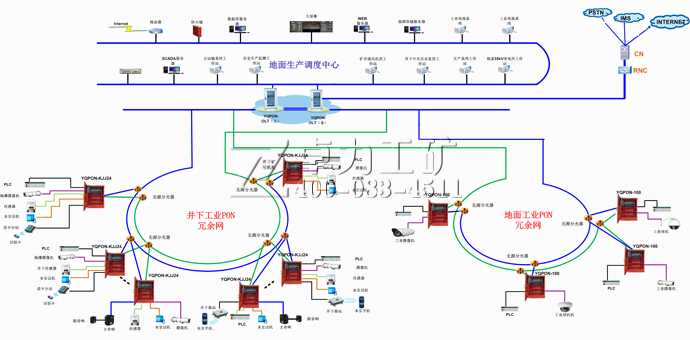 目工業(yè)PON環(huán)網(wǎng)系統(tǒng)為礦用環(huán)境直接提供以太網(wǎng)、POTS、CAN 、RS485和BNC等接口的子系統(tǒng)的信息接入,實現(xiàn)維護圖形化、遠程化、并且對全網(wǎng)重要設備實現(xiàn)備份,從而降低維護的難度提高了系統(tǒng)的安全性。該系使用硬件切換技術,可保證冗余鏈路切換時間<2ms,系統(tǒng)快速自愈,不會丟失系統(tǒng)數(shù)據(jù)。該系統(tǒng)代表了礦用信息通信領域最線前沿的技術方向。同事該系統(tǒng)在同一傳輸網(wǎng)絡平臺和軟件平臺的基礎上,將最新傳輸技術應用在生產(chǎn)、管理調度、監(jiān)控檢測等各個環(huán)節(jié),進而完善、改進和整合現(xiàn)有井下各個系統(tǒng)的同時,實現(xiàn)了煤礦的安全、生產(chǎn)、經(jīng)營和管理等信息集成。拓撲圖