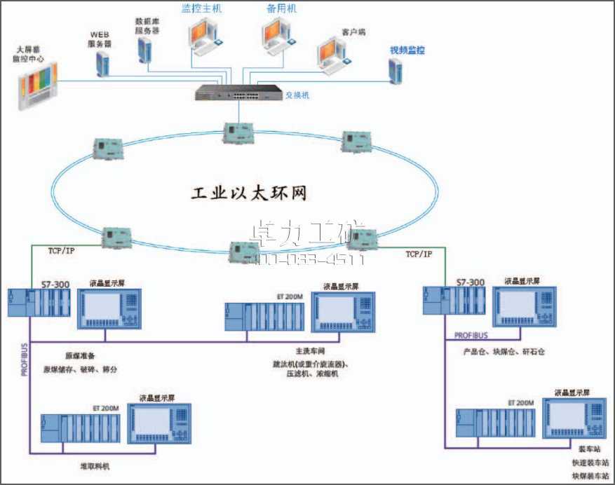 上位監(jiān)控管理系統(tǒng)由計算機監(jiān)控管理站、集控調(diào)度控制臺、工業(yè)控制計算機、大屏幕工業(yè)控制顯示器等組成。監(jiān)控計算機安裝Windows操作系統(tǒng)和洗煤廠自動控制系統(tǒng)組態(tài)軟件,系統(tǒng)完成原煤準(zhǔn)備、洗選、煤泥水處理設(shè)備的監(jiān)控和對裝車站設(shè)備的監(jiān)測裝車站可設(shè)備計算機完成對裝車系統(tǒng)設(shè)備監(jiān)控.組態(tài)軟件:選用主流組態(tài)軟件(西門子Wincc),工作于Window2000/XP平臺,完成所需的圖形監(jiān)控、動態(tài)圖形顯示、歷史數(shù)據(jù)采集、狀態(tài)趨勢圖、自診斷、報警等諸多功能。