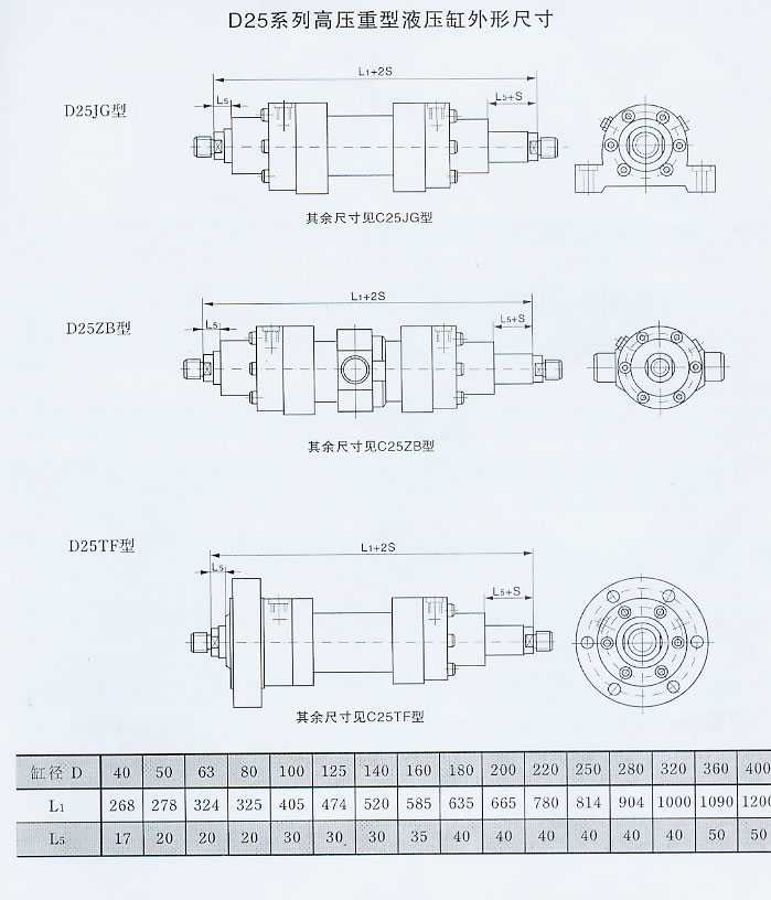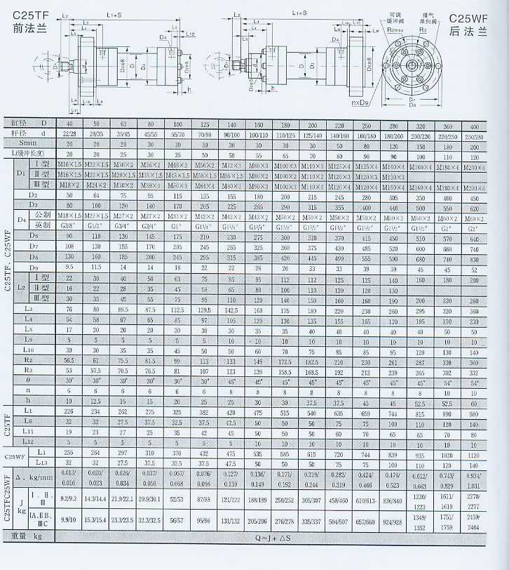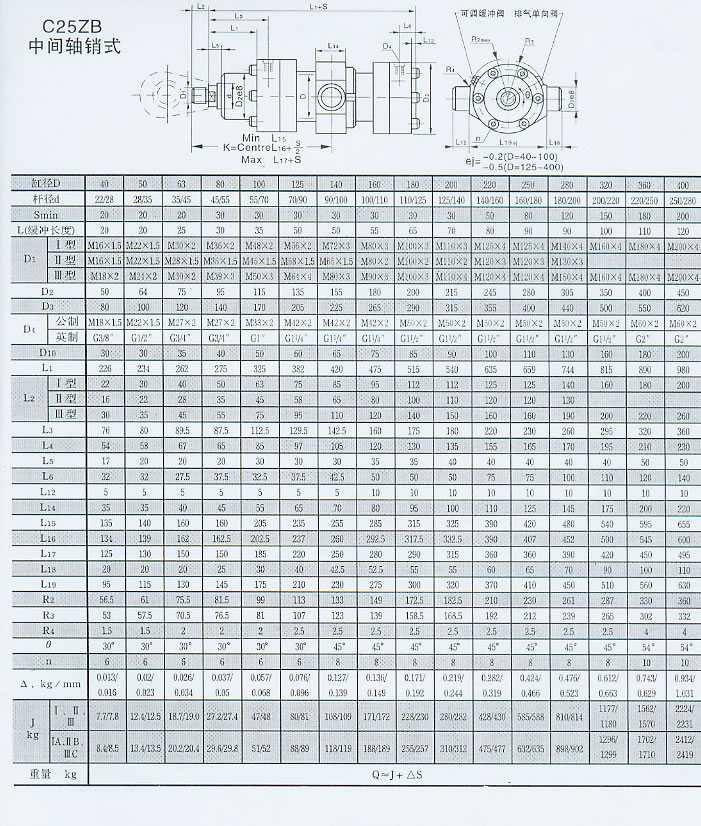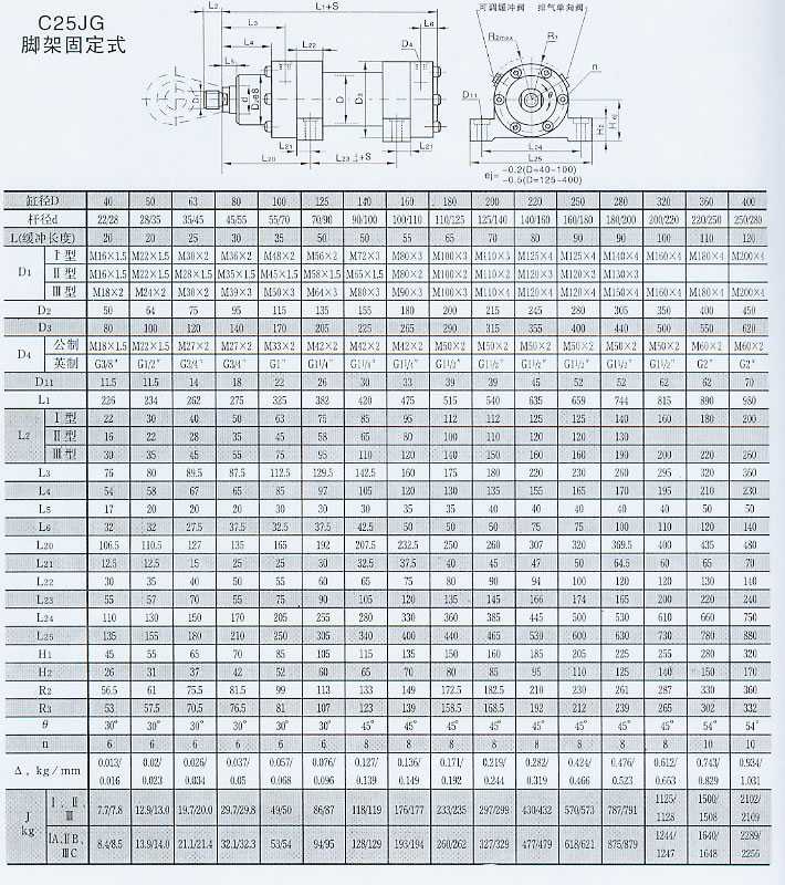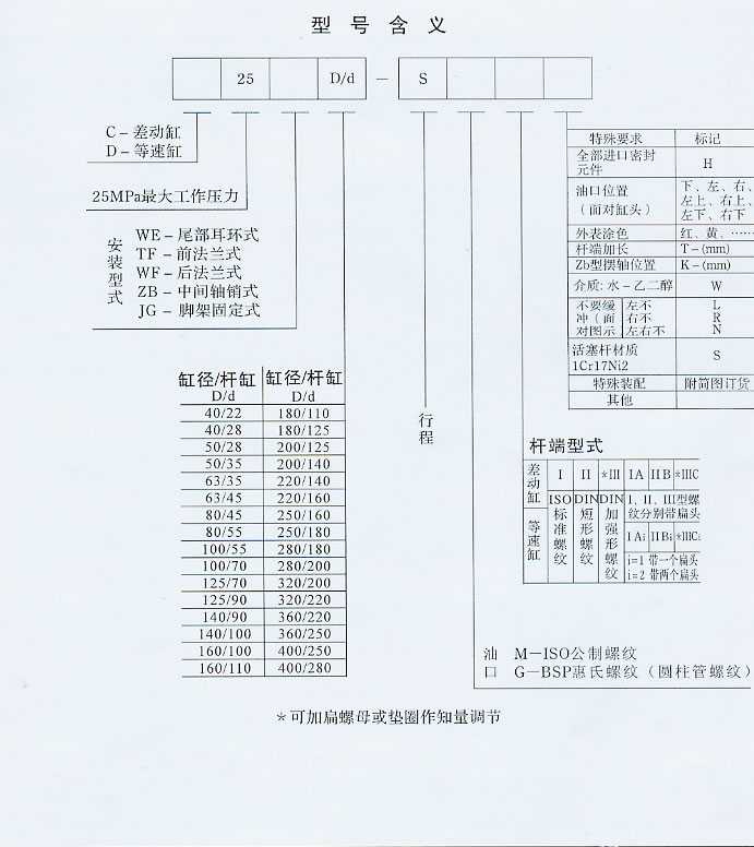 C25、D25系列液壓缸共16個缸徑規(guī)格,各有2×8個裝配型式,組成256個品種。液壓缸為雙作用單活塞型式,有差動缸和等速缸之分,帶可調緩沖(或不帶),亦可配防護罩。