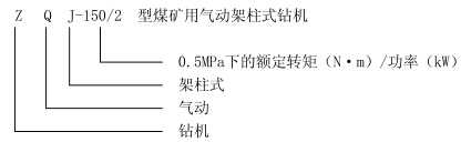 型號示例:ZQJ-150/2 型煤礦用氣動架柱式鉆機(jī):Z 表示鉆機(jī);Q 表示氣動驅(qū)動回轉(zhuǎn)器;J 表示架柱式;150/2 表示在 0.5MPa 氣壓下的額定轉(zhuǎn)矩為 150N·m,此時(shí)回轉(zhuǎn)器功率為 2kW。